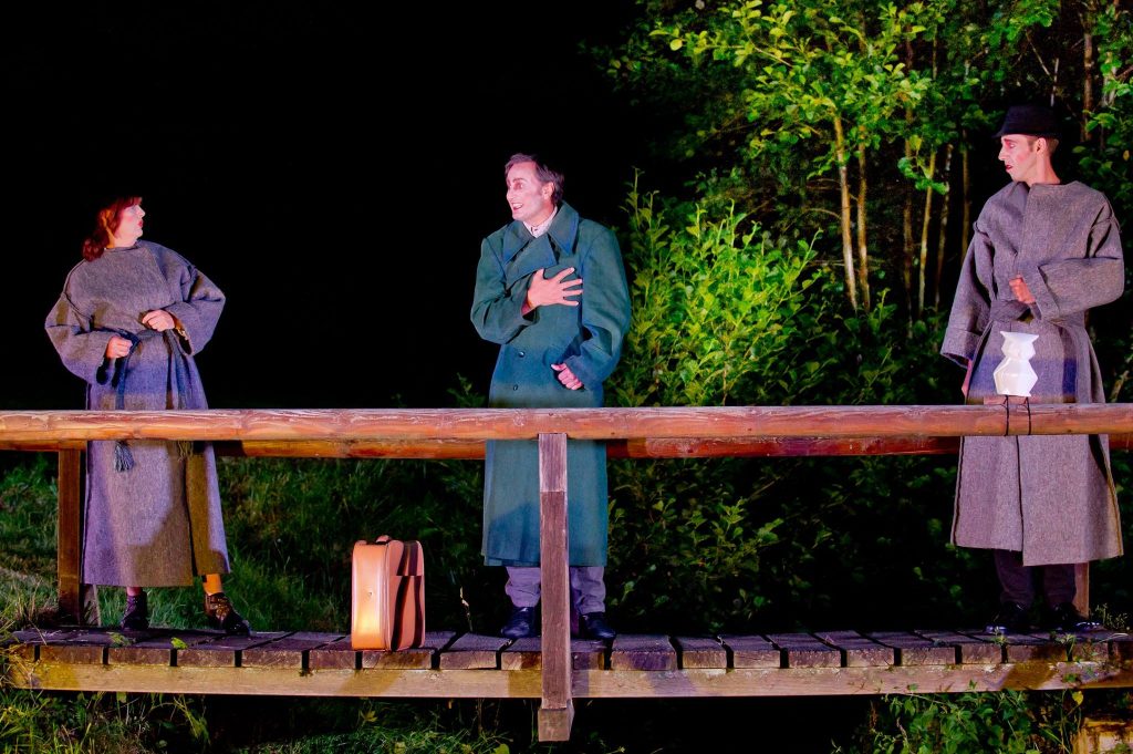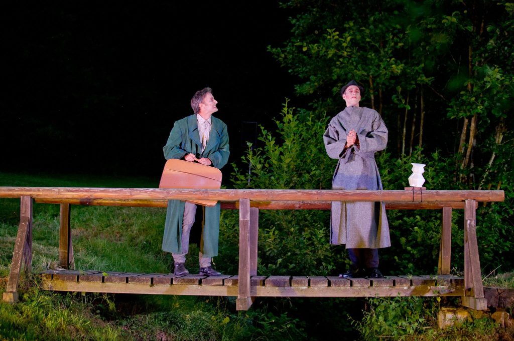 The piece plays on a simple wooden bridge, which leads across a border river, connects two unnamed states. On the one hand, the border guard Thomas Szamek watches at the end of the bridge, and the border organ Constantine at the opposite end. The focus is on Ferdinand Havlicek. He was deported after the bankruptcy of his drugstore from the state in which he had lived for half a century. Over the bridge he wanted to return to his native country. However, he had forgotten to carry out the necessary renewal of the citizenship there every five years, so that he could no longer enter. It is only through his help in the transfer of a smuggling couple that he receives a reward as well as an entry permit.